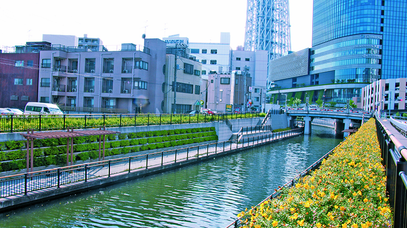 東京スカイツリー南側を流れる北十間川において、護岸設計と低水路の景観設計を実施。ランドマーク直下から連続する河川テラスの整備方針に基づき、都市景観と調和するデザインを追求。水辺に親しめる空間創出を目的に、安全性や利用者の快適性にも配慮した親水空間を形成。