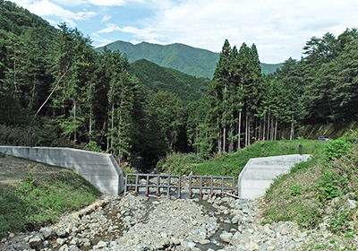 山梨県の奥野川に透過型砂防堰堤、床固、側壁護岸を整備するための予備および詳細設計を実施。除石を主な目的とする管理用道路も設計。