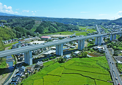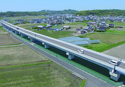 佐賀県の国道444号芦刈南ICの橋梁(鋼床版箱桁橋、L=54m)を設計。軟弱地盤上の橋梁になることから地盤改良や軽量盛土等の対策を実施。
