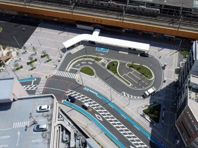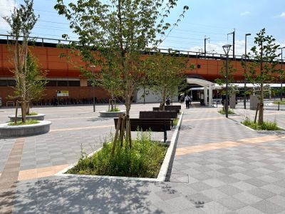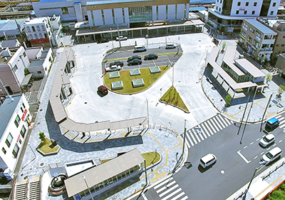 埼玉県戸田市の土地区画整理事業に合わせて駅前広場を再整備。自動車空間のコンパクト化により、歩道や憩いの空間を最大限に確保。イベントエリアを車両対応の歩道舗装として、キッチンカーの出店を容易にした。歩行者利便増進道路(ほこみち)制度によるさまざまなイベントにより、広場の賑わいが創出されている。