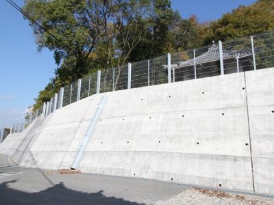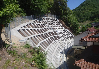 兵庫県朝来市和田山町栄町地内に対する急傾斜地崩壊対策。避難所を含む危険斜面が確認されたため、現場打ち吹付法枠工+鉄筋挿入工の詳細設計を行った。