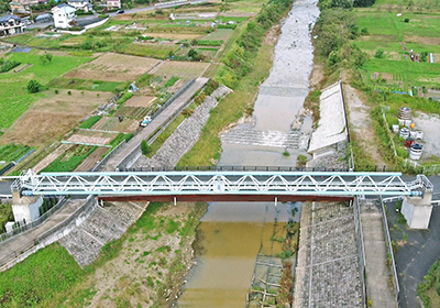 厚木市内の一級河川玉川に架かる奨学橋は、幅員が狭く通学時の危険が懸念されていた。安全性の確保のため仮設人道橋の配置を検討し、実施設計を行った。