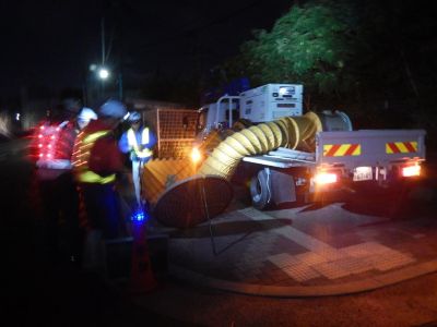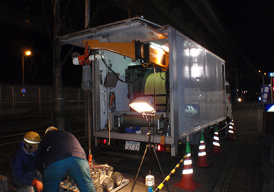 大阪府日本万国博覧会記念公園事務所が管理する、中国自動車道を跨ぐ橋梁の点検を夜間に行った。幅員が広幅員のため、大型橋梁点検車を利用した。