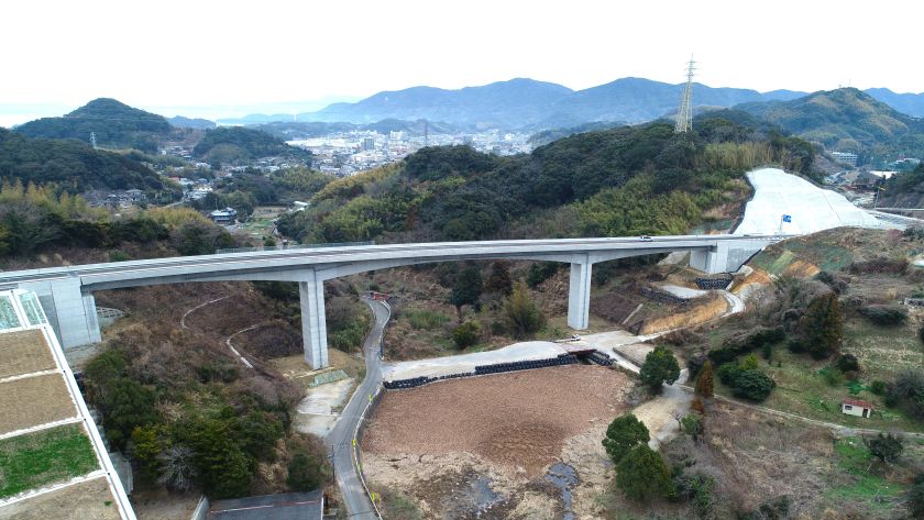 長崎県の西彼杵道路時津ICの橋梁。形式はPC3径間連続ラーメン箱桁橋で、橋長190m(センタースパン89m)。周囲の自然景観との調和や将来の交通需要を考慮した構造となっている。将来、道路が長崎まで延伸された場合は時津ICのオフランプ橋として使用される予定である。