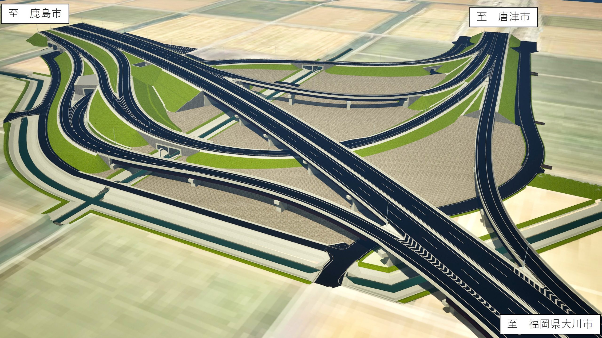 本JCTは佐賀県南部を横断する「有明海沿岸道路」と佐賀県を縦貫する「佐賀唐津道路」を接続するエリアで「Tゾーン」と呼ばれている。我が社ではこれまで、JCT予備修正設計を皮切りに、JCT詳細設計やBランプ橋予備設計、JCTのBIM/CIM業務(佐賀県初)を行った。上記図はJCT全体の3Dモデル図である。