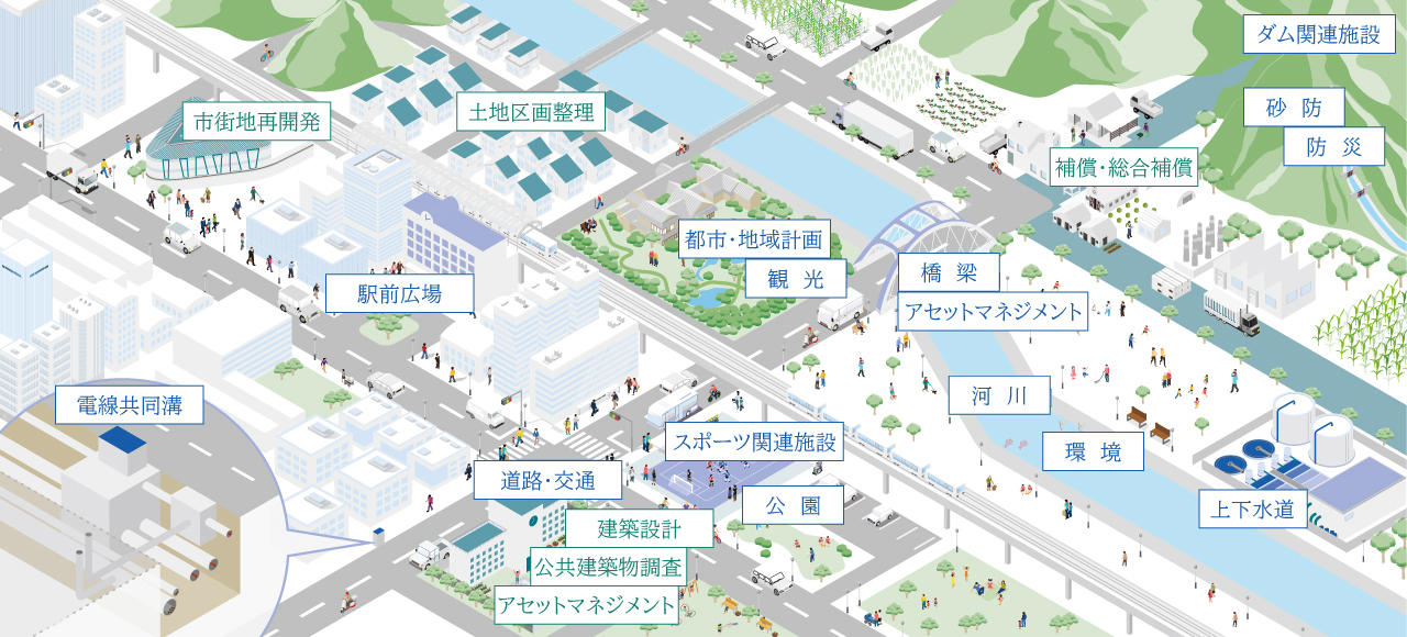私たちは、道路、河川、公園、上下水道など、さまざまな社会インフラの建設プロジェクトにおいて、設計者として働いています。また、設計だけにとどまらず、都市計画、地質調査、環境調査、インフラマネジメントなど、社会インフラに関連するさまざまな仕事をしています。